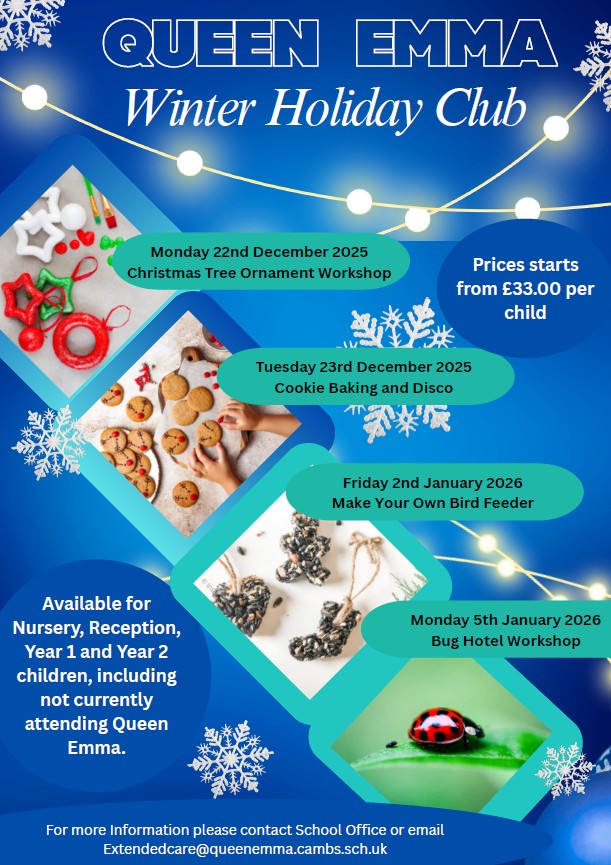 Queen Emma Nursery Holiday Club is managed by Queen Emma Primary School and is an additional service to provide quality childcare for Nursery, Reception, Year 1 and Year 2 children, including children not currently attending Queen Emma Primary School.